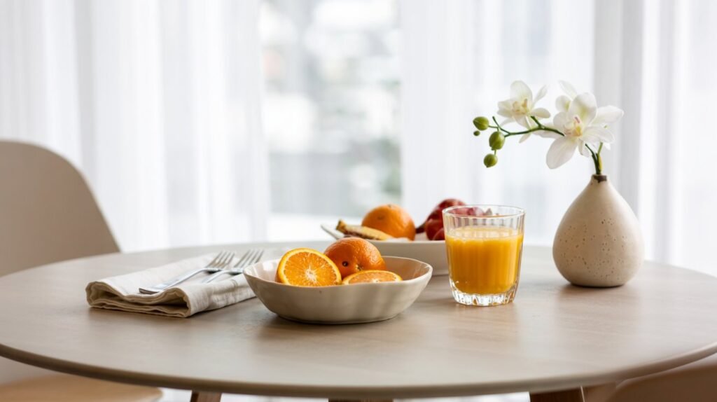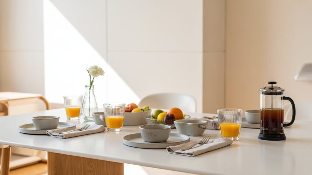 Dica prática: se tiver pouco espaço, monte uma pequena “ilha de pequeno-almoço” num aparador ou bancada auxiliar, com bebidas, talheres extras e guardanapos.