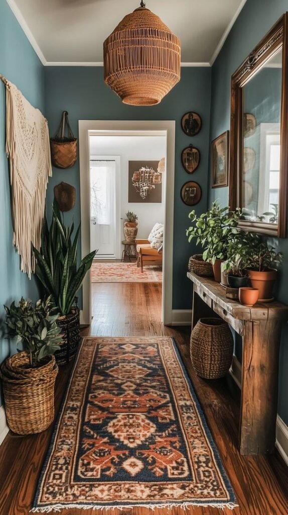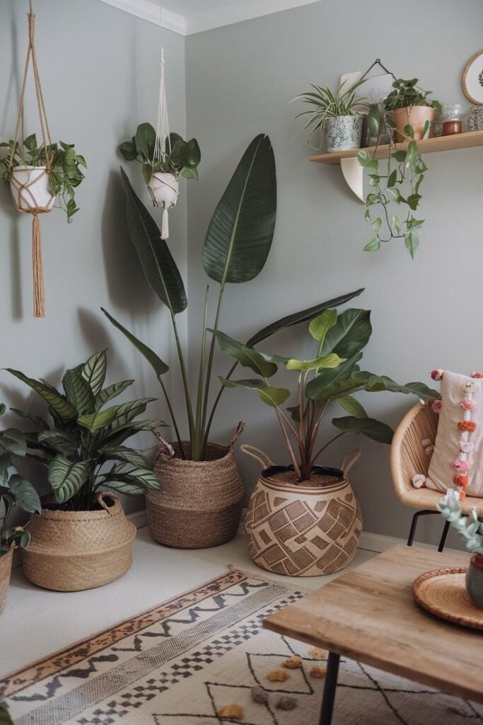 Uma das grandes vantagens da decoração Boho é a forte conexão com a natureza. Vasos de cerâmica com plantas, cestos de fibras naturais e paletas de cores terrosas ajudam a criar uma atmosfera acolhedora e relaxante.