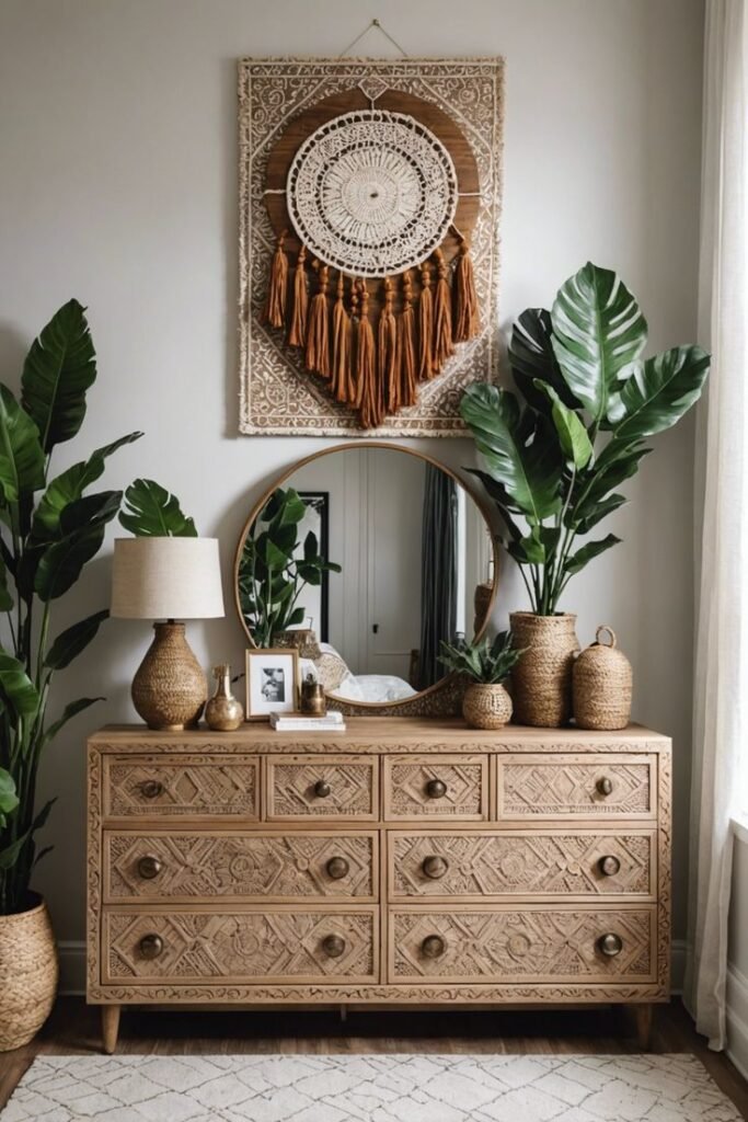 A decoração Boho valoriza o uso de materiais sustentáveis e práticas conscientes. Tecidos naturais como algodão e linho, móveis de madeira reciclada e objetos feitos à mão são escolhas que fazem a diferença tanto no visual quanto no impacto ambiental.