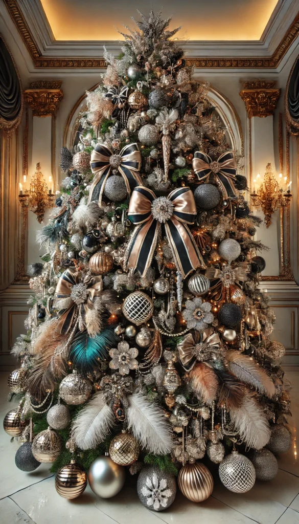 Para aqueles que gostam de uma decoração mais exuberante, o maximalismo é uma tendência a seguir. Árvores repletas de ornamentos, laços grandes, plumas e fitas metalizadas criam um visual opulento e glamoroso. Não tenha medo de misturar texturas e padrões para obter uma árvore que realmente se destaque.