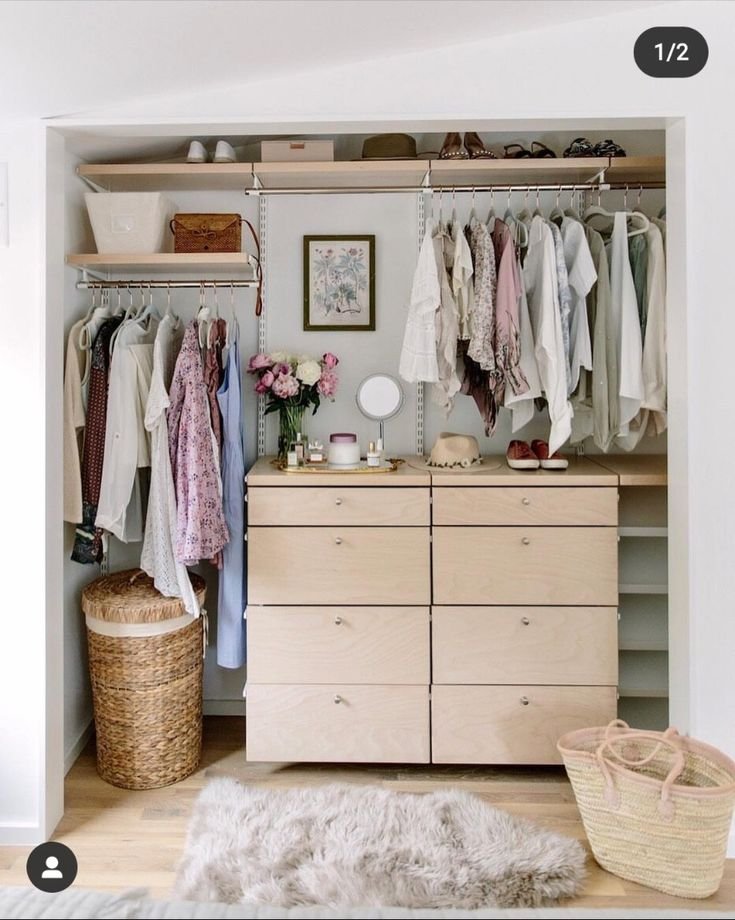 Para manter a estética, escolhe cabides bonitos e uniformes (de madeira ou metal), e organiza as roupas por cores. Caixas de tecido ou vime nas prateleiras inferiores ajudam a esconder peças íntimas ou miudezas.