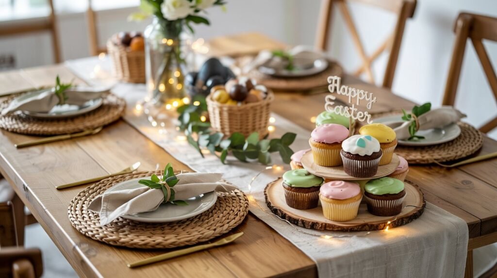 Para deixar a sua mesa ainda mais especial, crie marcadores de lugar personalizados. Pequenos cartões com o nome dos convidados ou mini ovos com etiquetas escritas à mão, dão um toque exclusivo. Outra ideia é usar biscoitos em formato de coelho como lembrancinha.