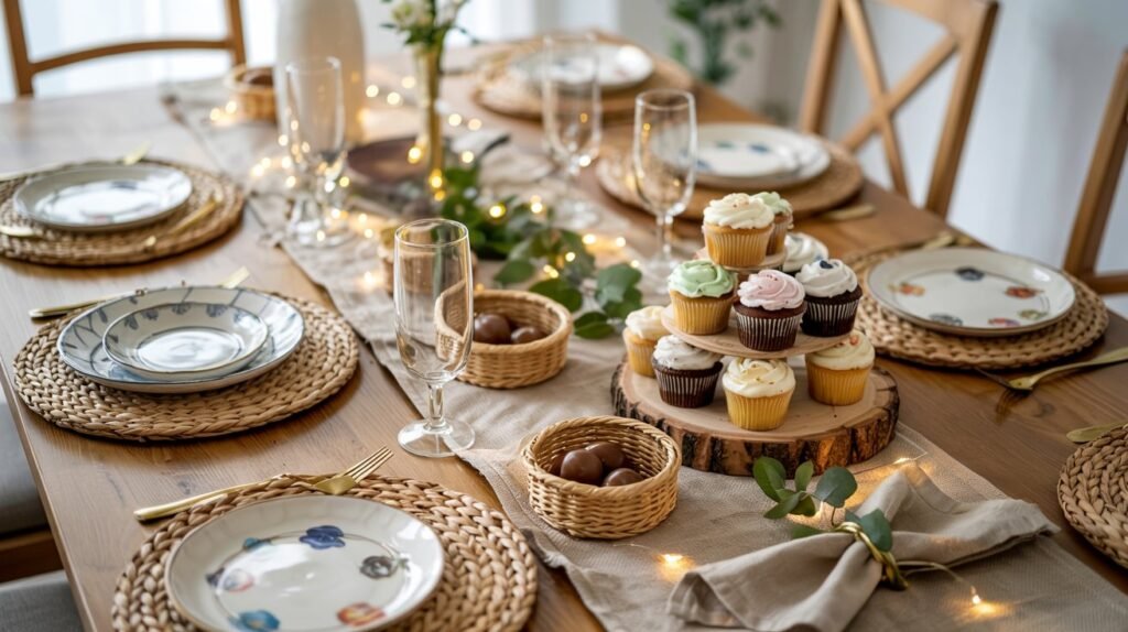 A sobremesa também pode fazer parte da decoração! Disponha uma torre de cupcakes ou um prato com um bolo decorado e doces temáticos para encantar os convidados.