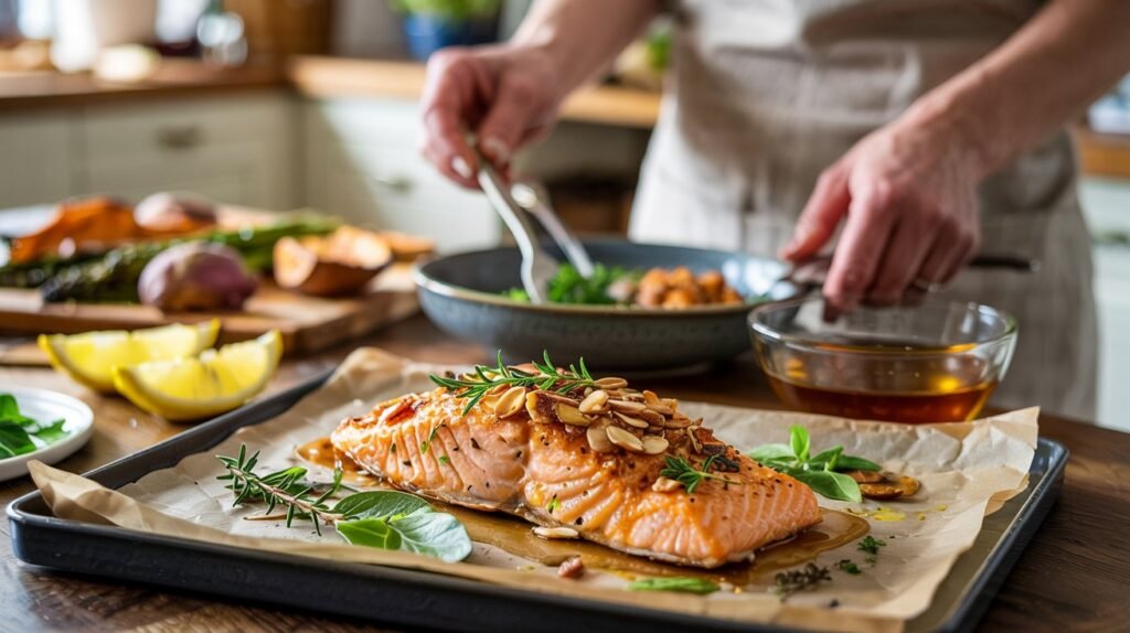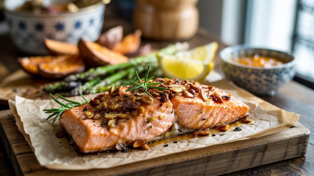 Se queres fugir ao tradicional bacalhau e impressionar com algo diferente, o salmão em crosta é a escolha ideal. A crocância das amêndoas e o aroma das ervas criam um prato memorável.