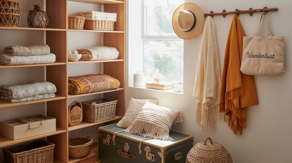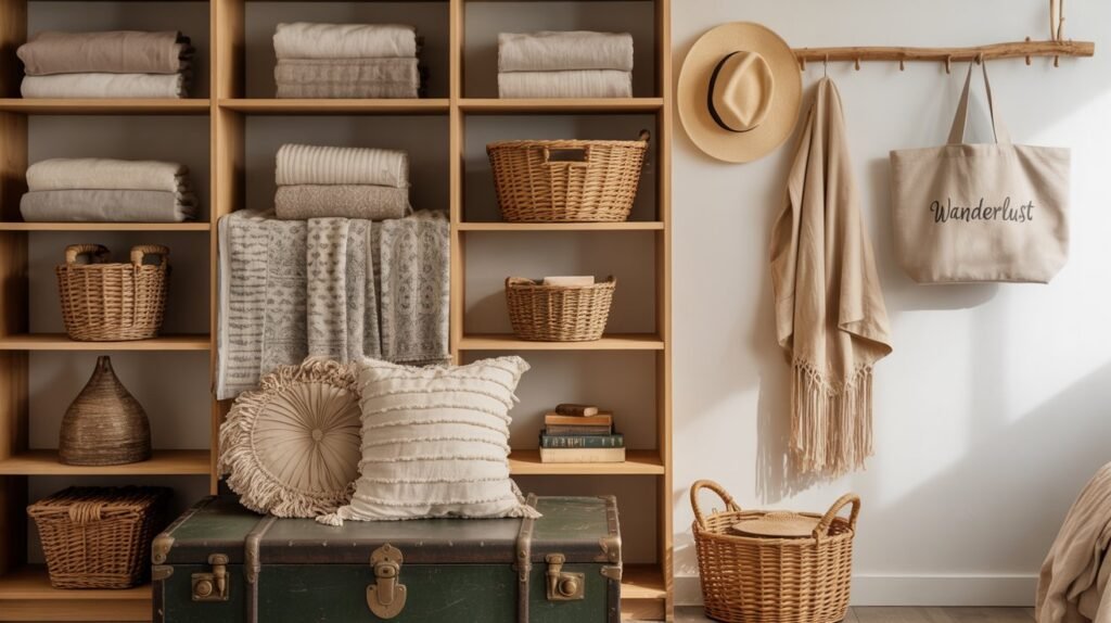 🧺 Organização no estilo boho é visualmente agradável e prática.