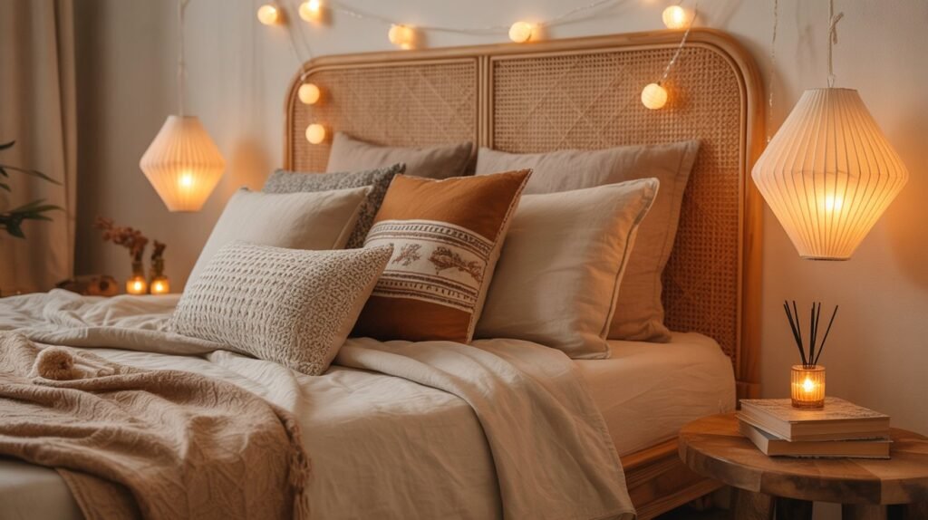 Algumas ideias: Candeeiros de mesa com abat-jours de tecido; Lanternas marroquinas ou luminárias de papel; Fios de luz (as famosas fairy lights) pendurados na cabeceira ou prateleiras; Velas aromáticas com notas amadeiradas ou florais.
